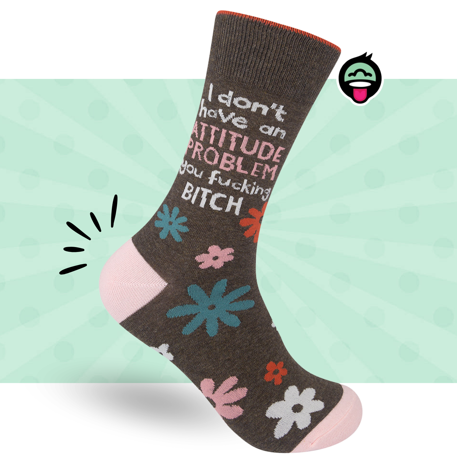 These deceptively pretty socks feature a soft brown background, a blush pink heel and toe, and a garden party of pink, white, orange, and teal flowers. But right there, nestled among the blooms, is the real showstopper: “I don’t have an attitude problem, you fucking bitch.”