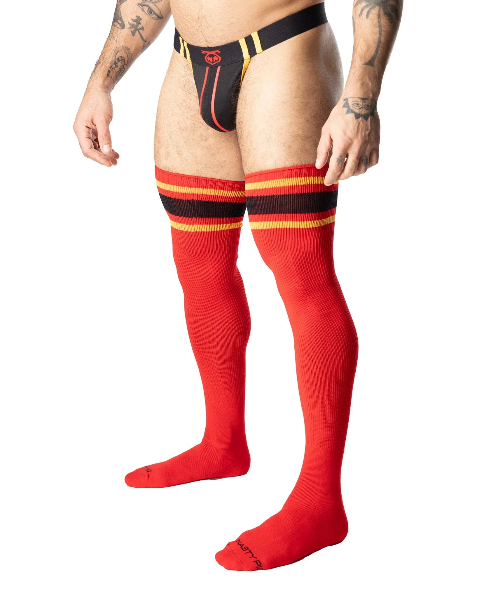 Turn your dollar-stuffing go-go fantasy into reality with the first-ever thigh high sock from Nasty Pig. The Hooked Up Socks serve classic athletic kink with a filthy twist—double stripes, thigh-hugging stretch, and our logo stamped loud and proud on the toes.
