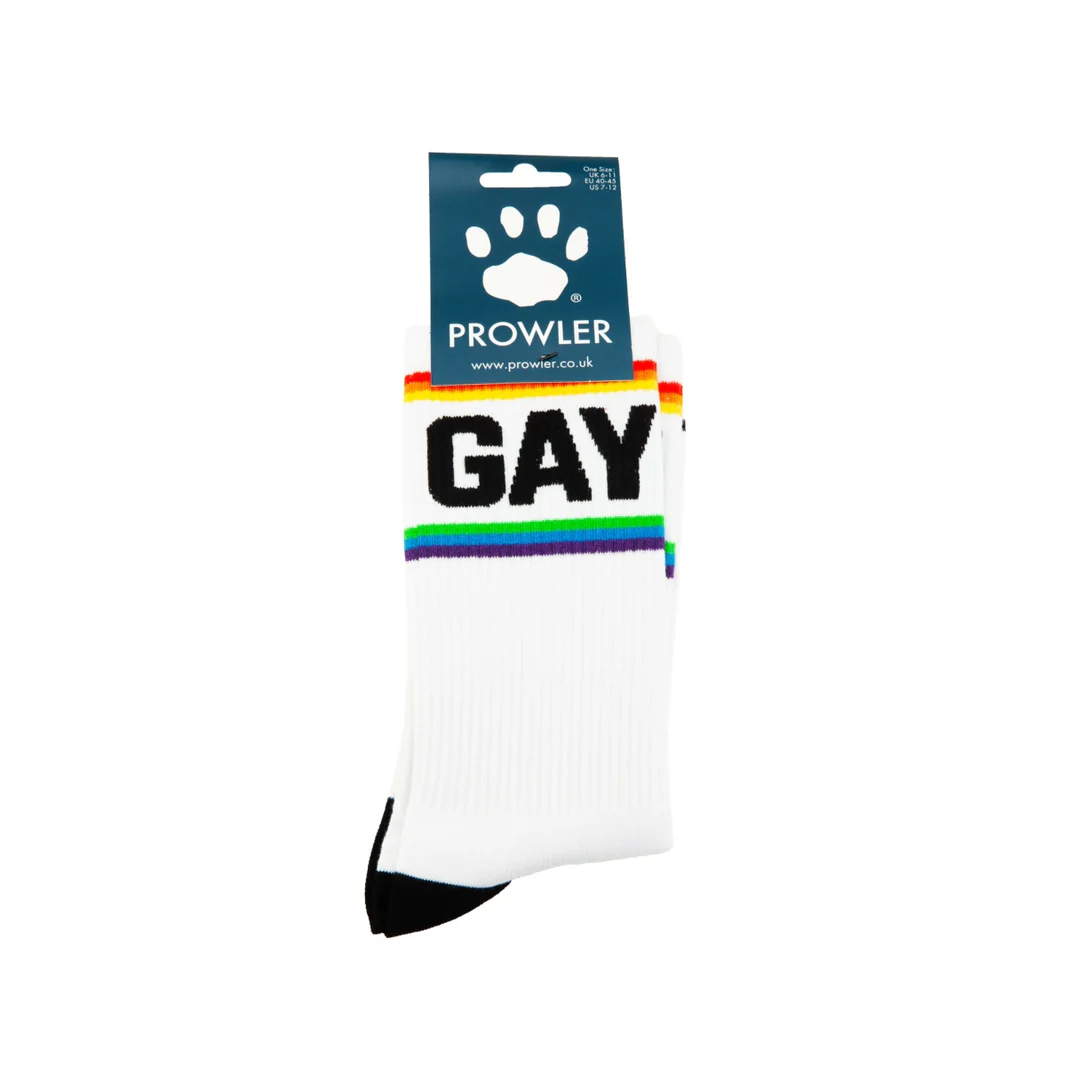 These Prowler socks are a great way to show off your support of the LGBT community and have some fun while doing it. True to the brand, these bad boys feature rainbow stripes along the band and black colored toes and heel, all while letting the world know where you stand with the word Gay displayed across the sock band. These Prowler socks are perfect for any occasion and can be worn with anything.
