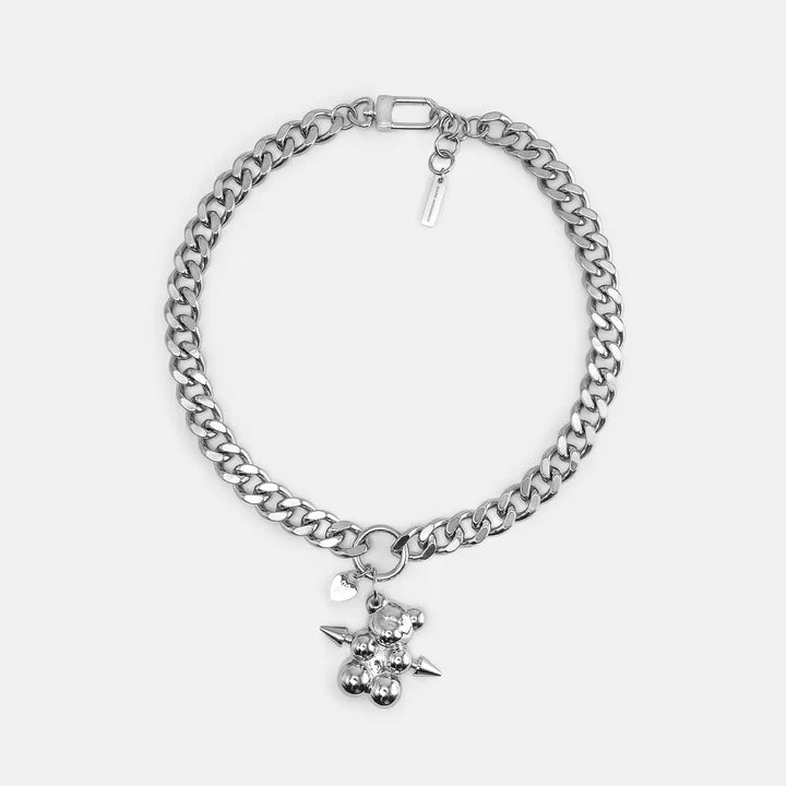 The ultimate RARE-ROMANCE piece. A thick Cuban chain holding a metal gummy bear pierced straight through the heart. Heavy, loud, and impossible to ignore.