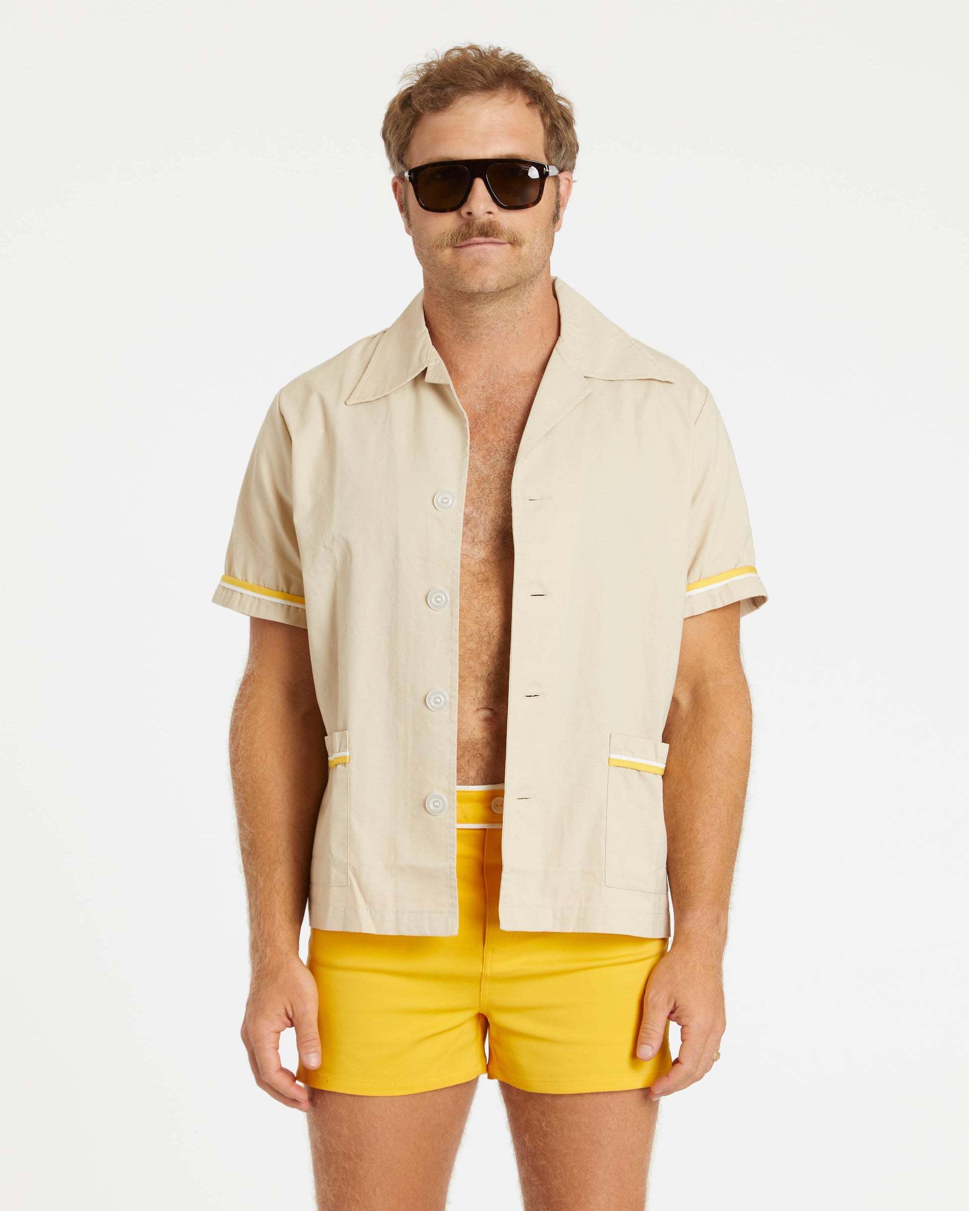 The shirt design is 100% true to its origins. The most iconic feature of the cabana shirt is the two cabana pockets on the front with contrasting trim. Like the original, it has a wide and short fit and oversized collar. It comes in three colorways (White/Navy/Red, Sand/Rust/White, and Sand/Gold/White) to match our four Cabana Trunk colors (navy, red, rust, and gold).