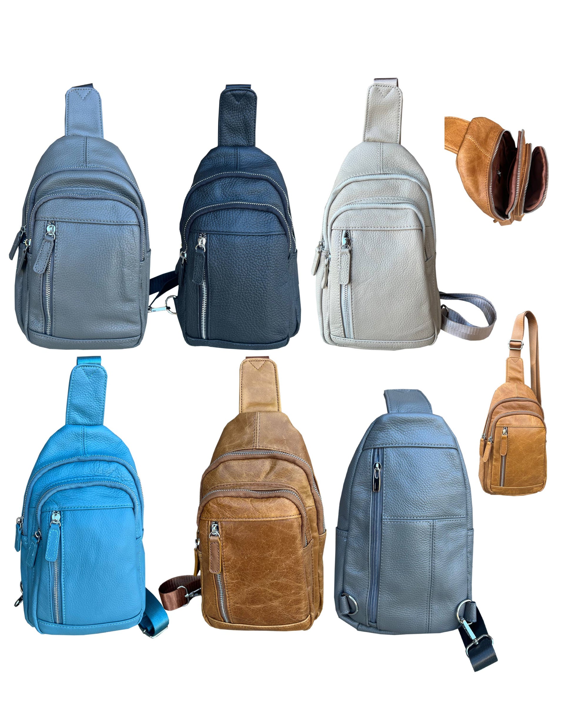 Sling bag / Compact Backpack Two spacious main compartments. One main compartment has Interior throw pocket and 1 zipper pocket 1 exterior vertical zipper pocket on front side for your accessories. Backside has 1 vertical zipper pocket Metal loops are to adjust which side the strap attaches Adjustable shoulder strap, Leather pulls Material: Cowhide leather Colors: black, cream, light brown, light blue, gray Size: 11 ¼”x 6½”x 3”